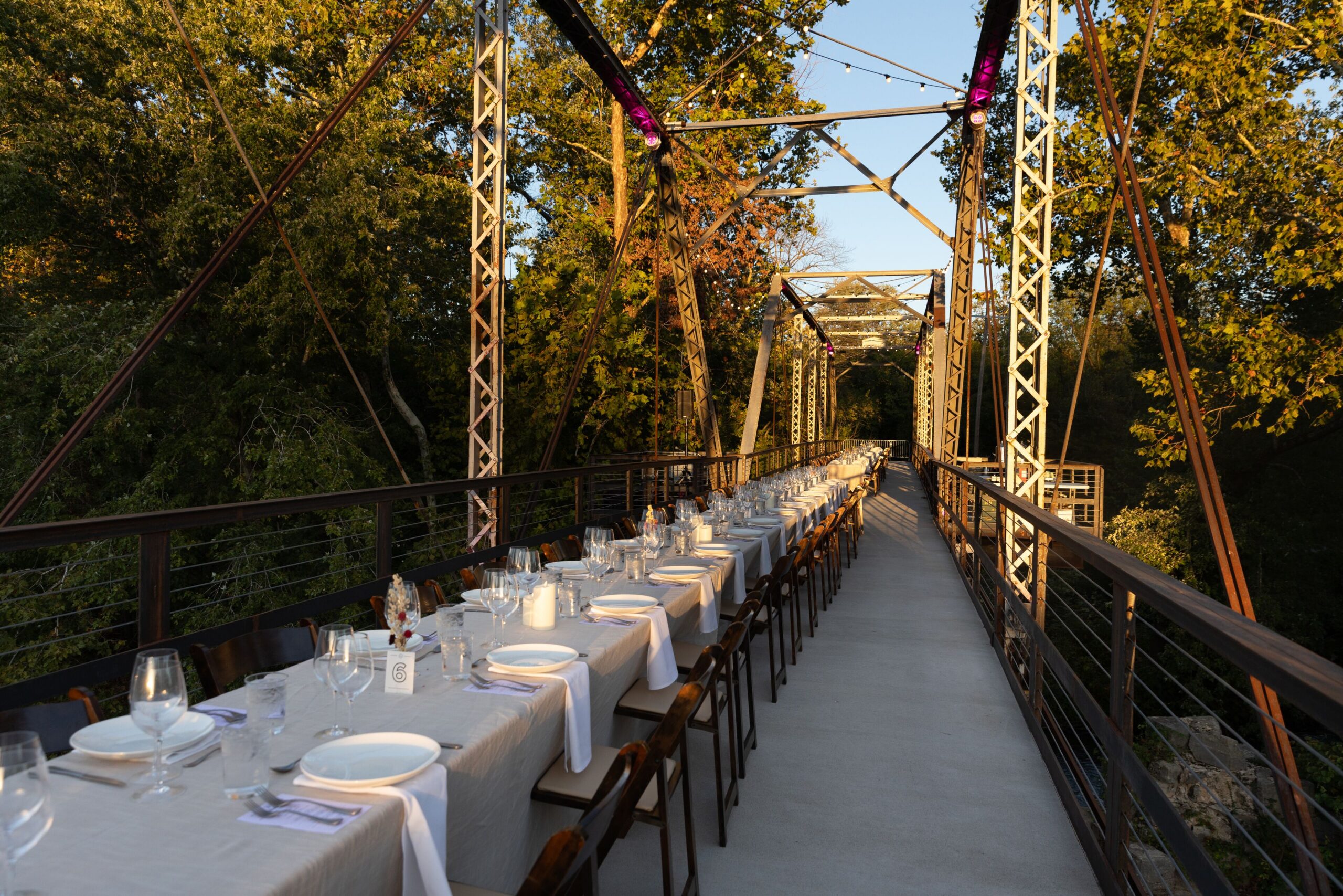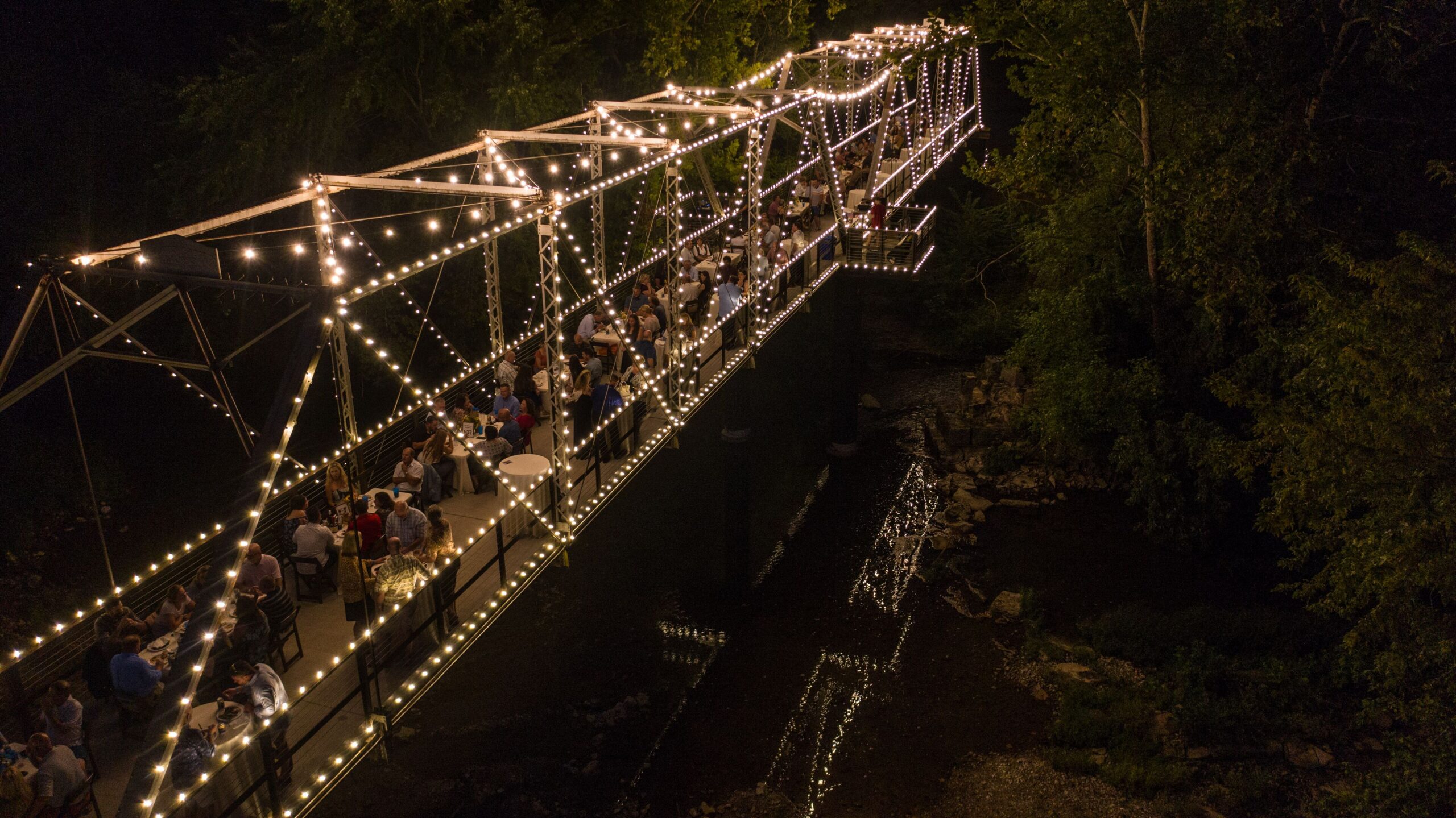 Originally built in 1909, the iconic Riverside Bridge is a one-of-a-kind outdoor event venue immersed in nature. Ideal for intimate dinners, cocktail hours or receptions, the bridge also allows wedding parties to easily make their way across the Finley River from The Chapel to The Ozark Mill on foot. The structure features dedicated spaces for live entertainment and a bar in addition to decorative lighting.